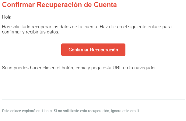 Por último revisa tu casilla de correo electrónico, donde encontrarás el e-mail de recuperar cuenta y presionamos el botón "Confirmar Recuperación".